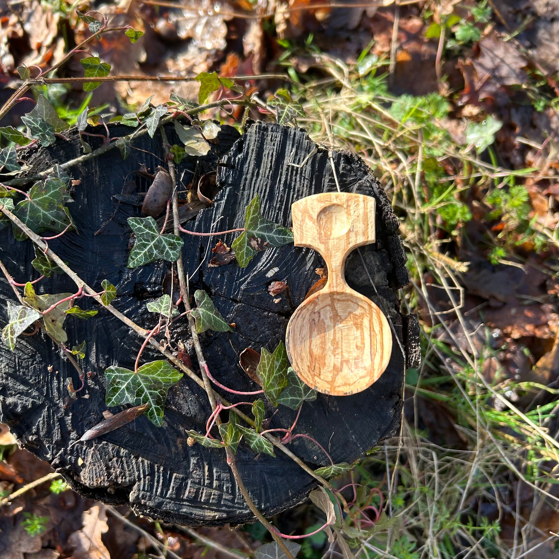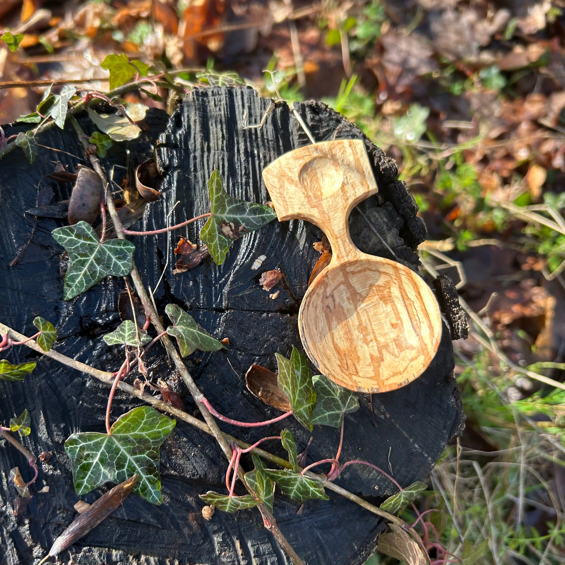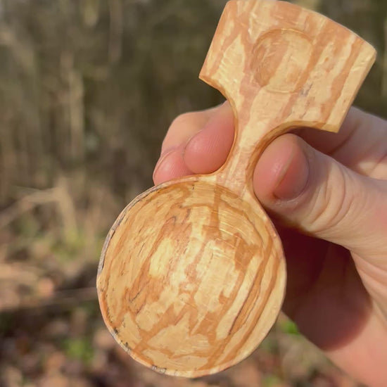 A shallower take on a coffee scoop, this caddy spoon is made from this stunningly patterned spalted Beech wood, kindly gifted from a friend in Oxfordshire.