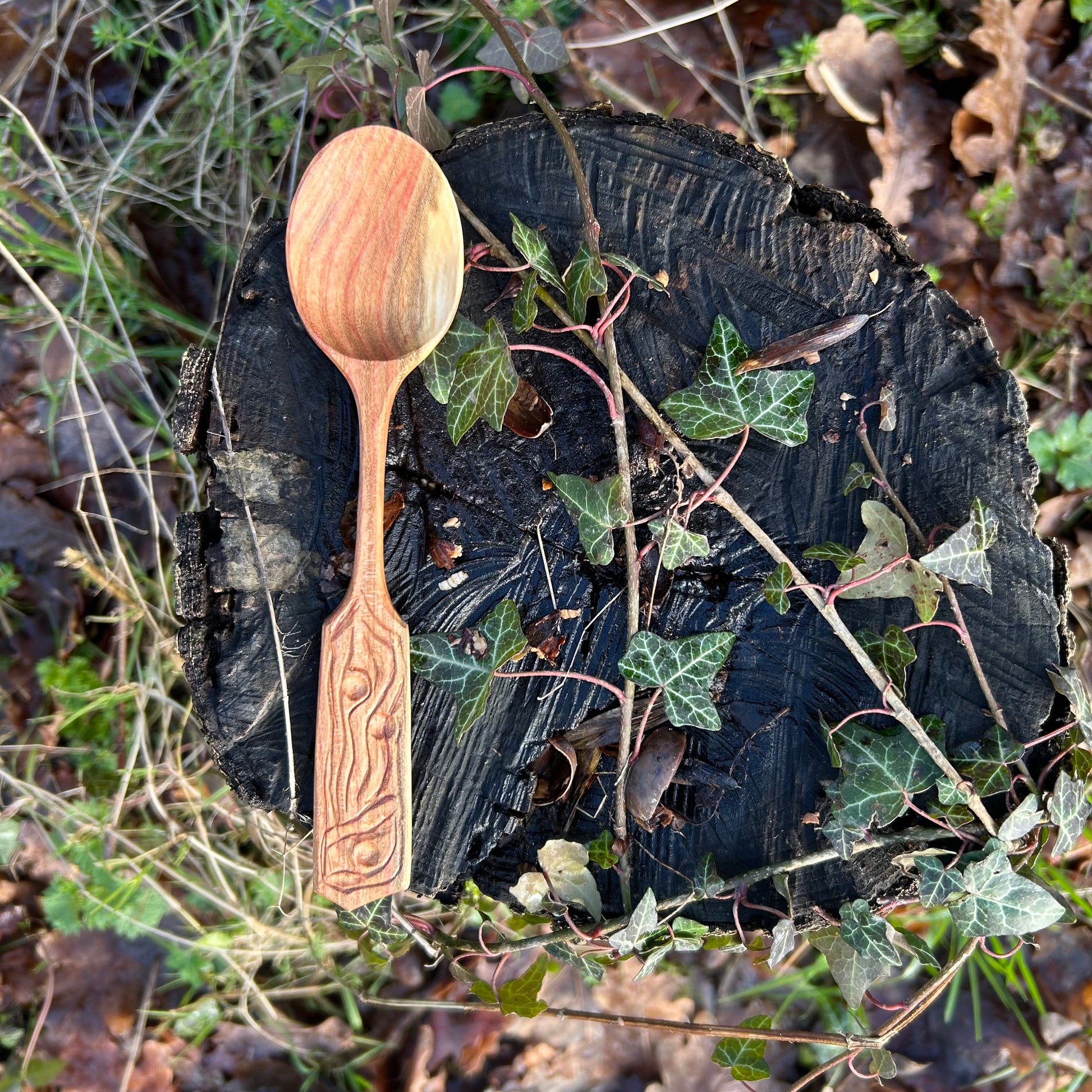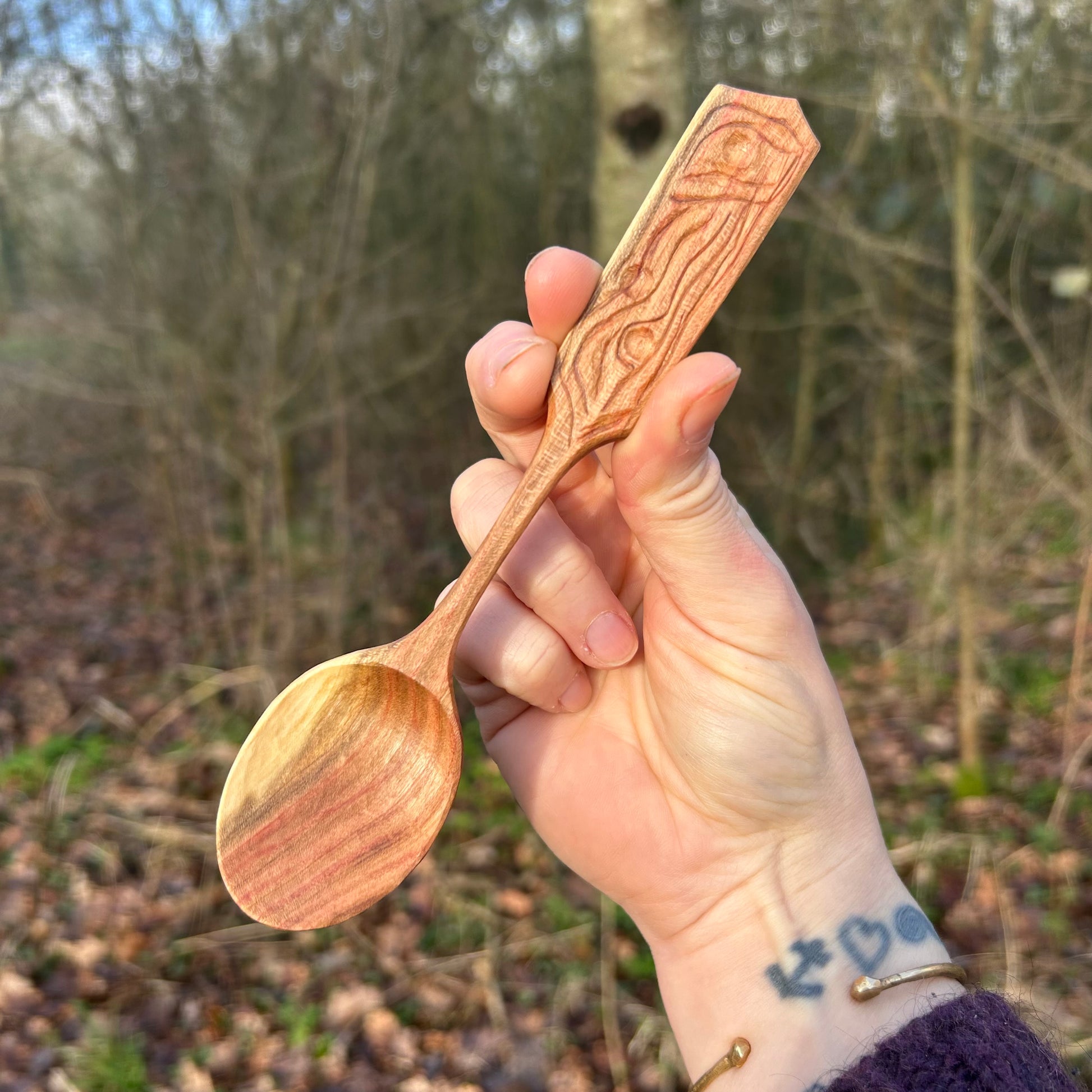 This is a hand carved wooden item and knife and tool marks may still be present. Please do not put wooden items in the dishwasher. Hand wash only with warm soapy water and leave to air dry. You may wish to oil your spoon every once in a while if it starts looking thirsty. A coat of food safe oil (tung oil, nut oils etc) will nourish the wood and keep it looking fresh.