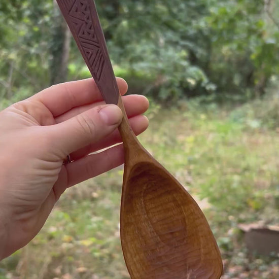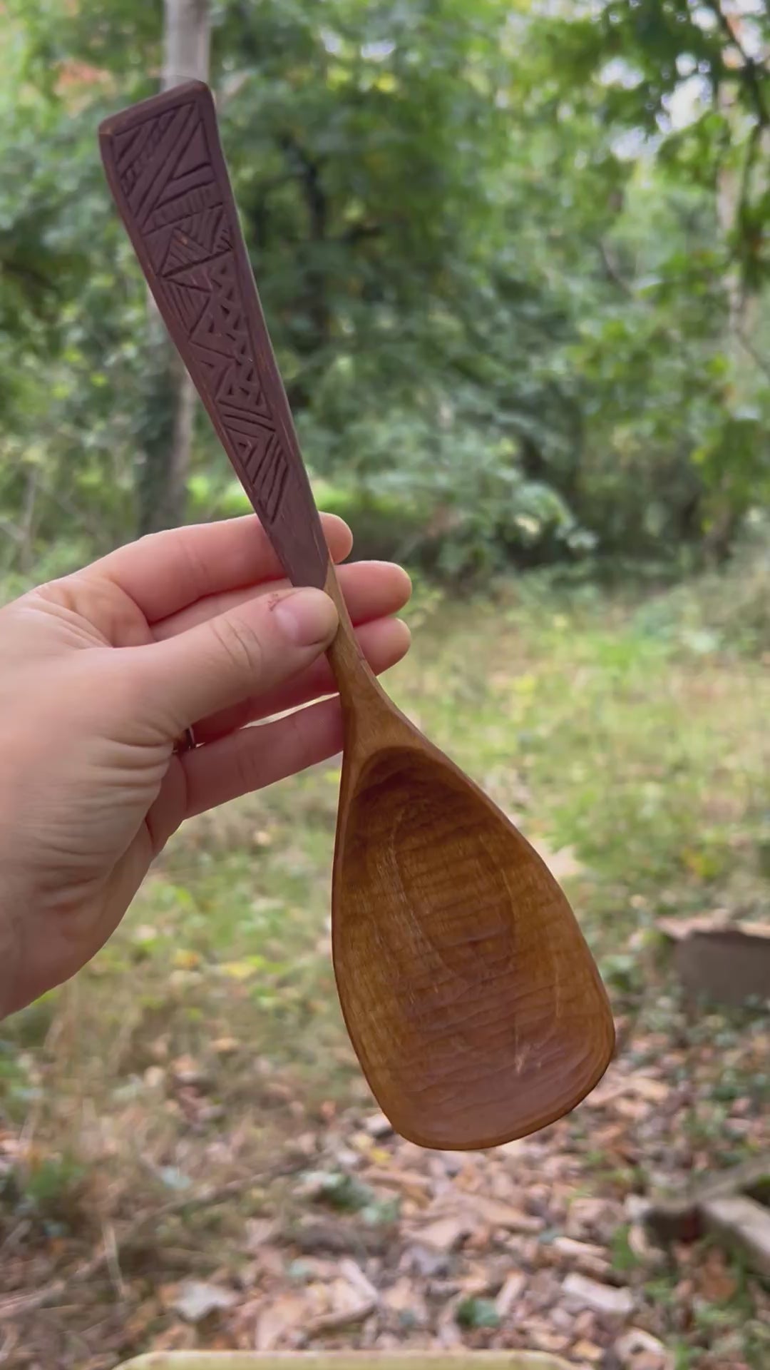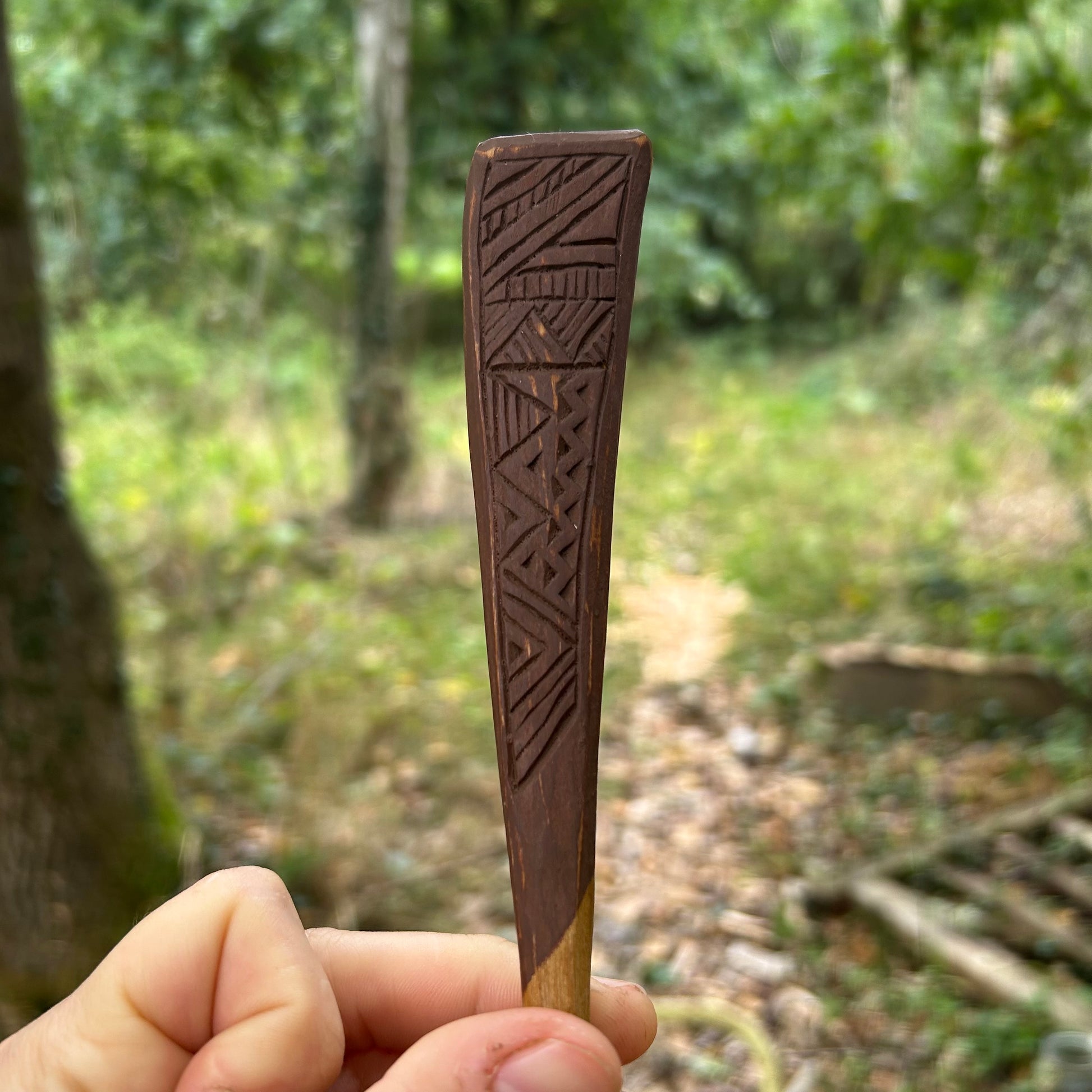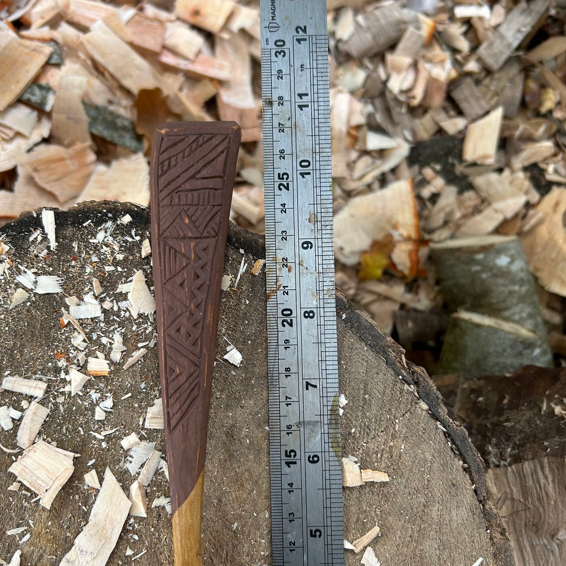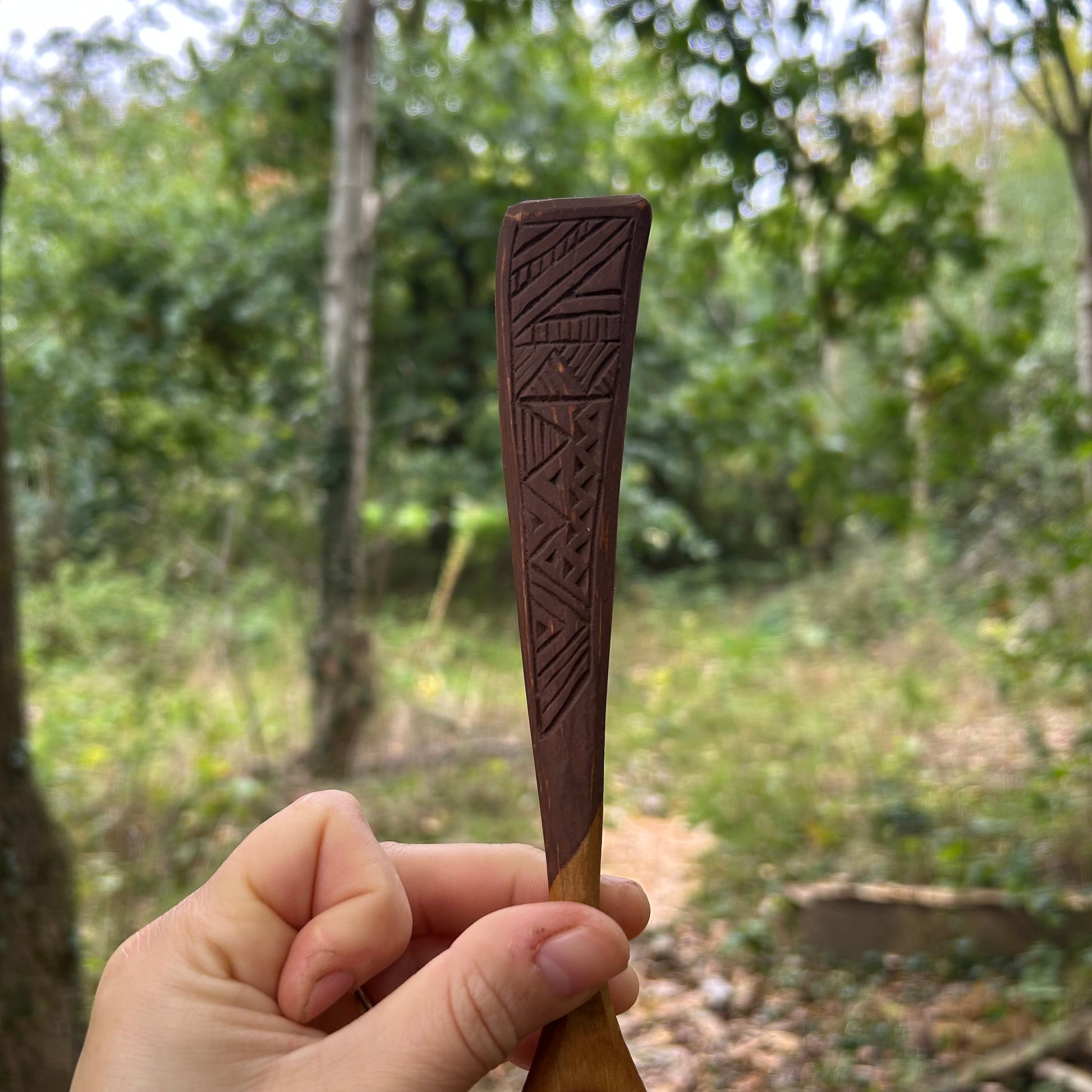 Finished with a tribal style chip carving in the handle and a textured bowl, makes it very lovely to hold.